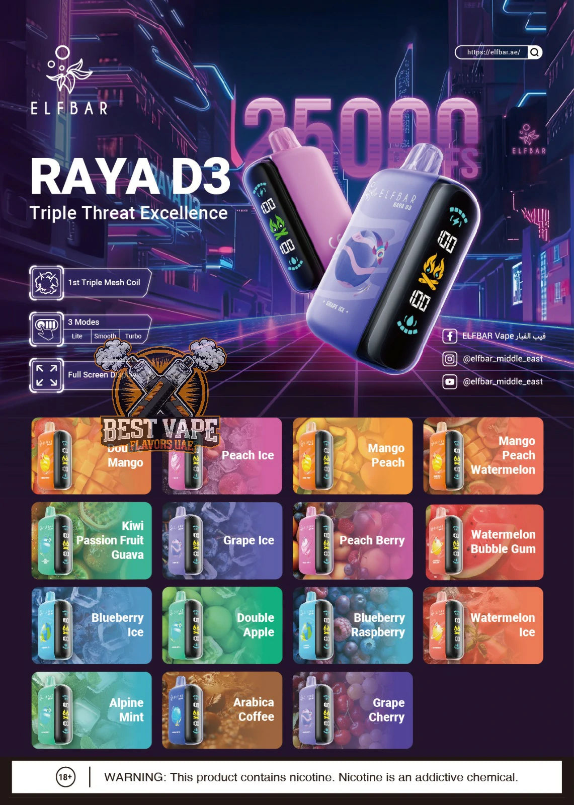 From vibrant fruity flavors to bold and refreshing options, the ELF BAR RAYA D3 provides an array of choices to suit every palate.