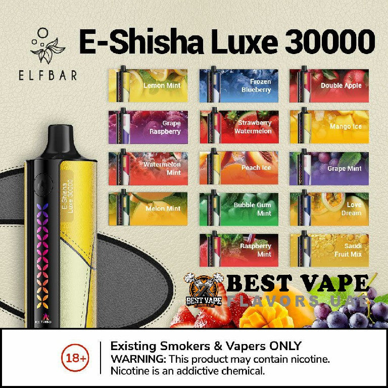 - The ELFBAR E-Shisha Luxe offers a variety of flavors, including fruity options like Watermelon Mint, Strawberry Watermelon, and Peach Ice, as well as refreshing menthol flavors such as Raspberry Mint and Grape Mint.