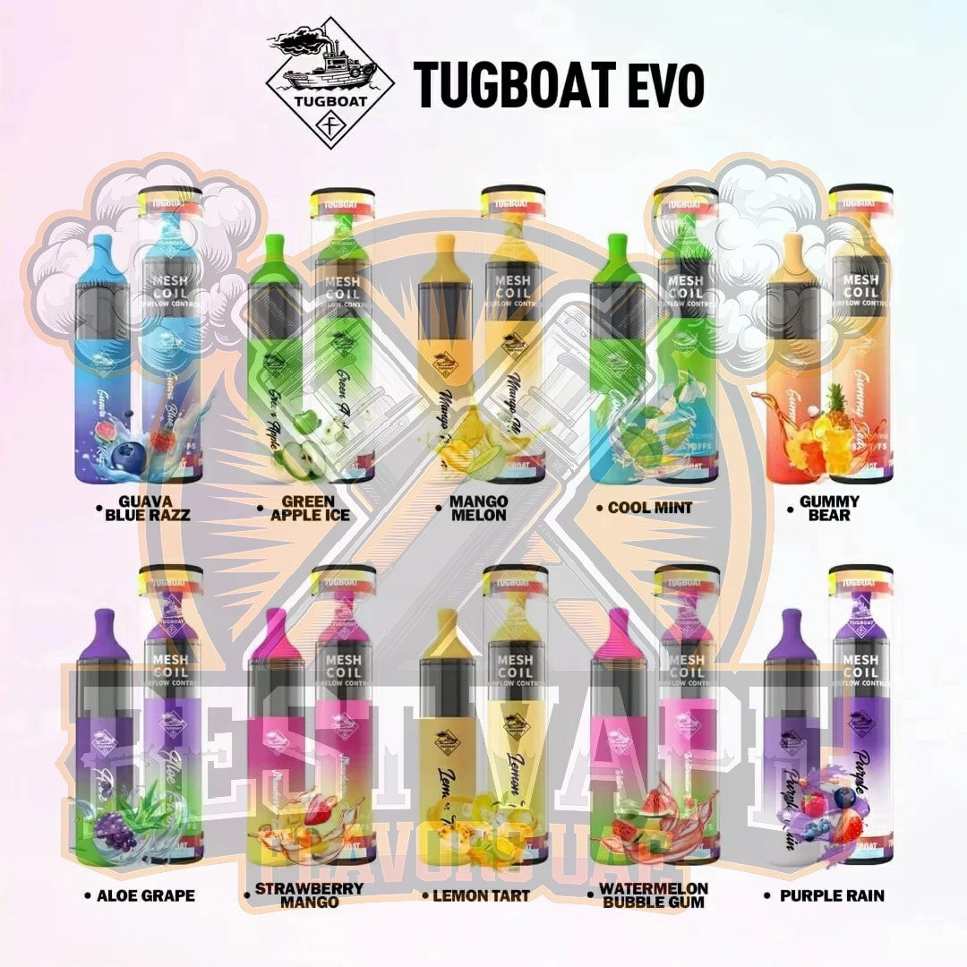 A: The Tugboat EVO comes in a wide variety of flavors, including fruity options like Guava Blue Razz, Mango Melon, and Strawberry Kiwi, as well as refreshing options like Cool Mint and Black Dragon Ice.