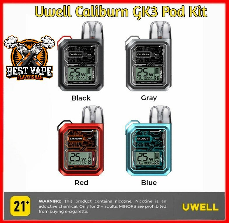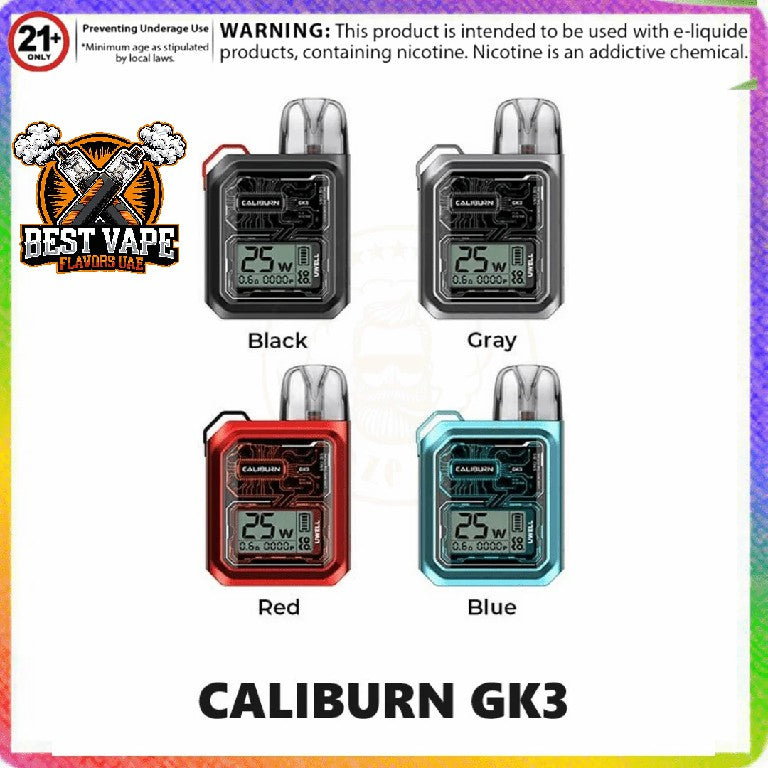 Available in a variety of striking colors, the Uwell Caliburn GK3 Pod Kit is a powerful yet stylish companion for your vaping journey in Dubai.